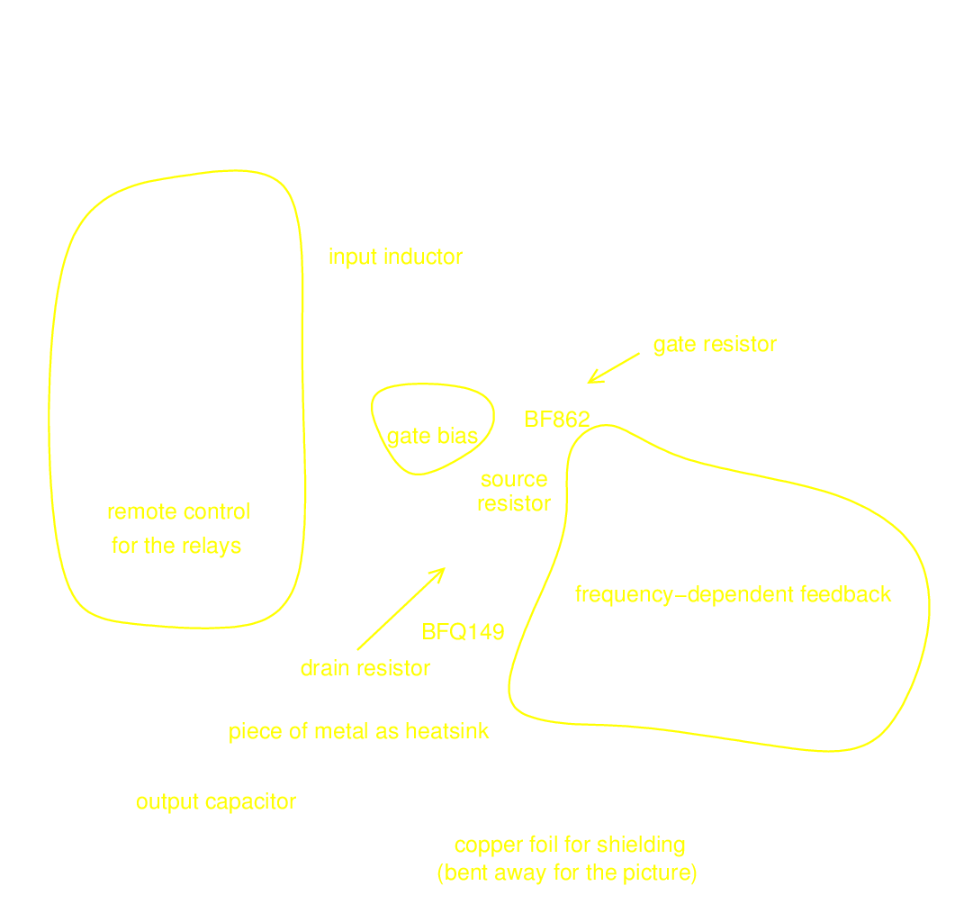 - There are two relays (the grey blocks) which can be remotely controlled (via the IC at the left). With these we can switch the input coil and the feedback circuit, which was useful for testing.