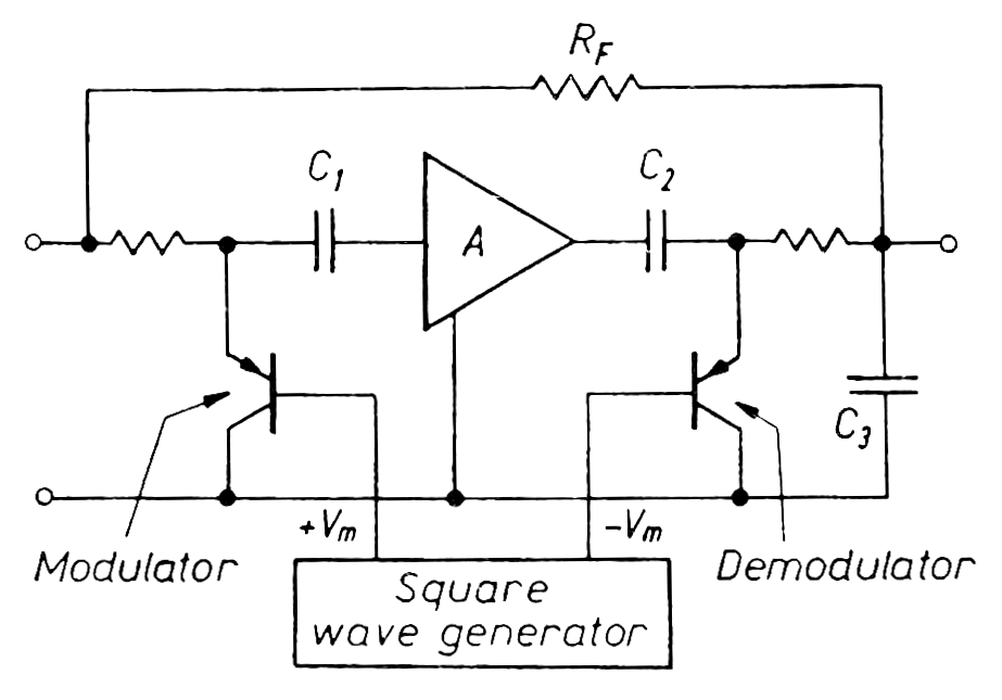The figure (from [8]) shows a chopper amplifier in which the switch is implemented as a transistor. The 'modulator' transistor periodically shorts the input to ground. In this case, but not always, there is another switching transistor to restore the DC level at the output, and there's feedback via RF.